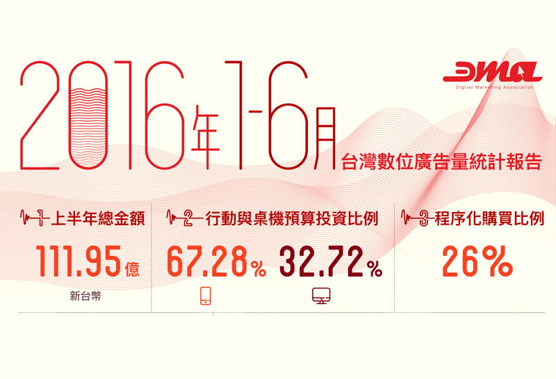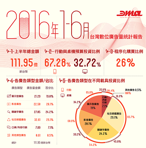 臺北市數位行銷經營協會(DMA)在今天(9/26)發布了由協會統計調查的《2016 年台灣數位廣告量上半年統計報告》,2016 年上半年台灣數位廣告量達到新台幣111億元,由於數位行銷方式越來越多元,今年新增三個調查項目包括社交媒體廣告、內容行銷(與原口碑行銷合併)及其他類型廣告。
