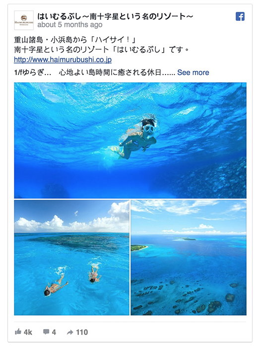 這是度假飯店「はいむるぶし~南十字星という名のリゾート~」的官方臉書專頁,該飯店位於日本八重山群島的小濱島上。與其介紹飯店房間狀況,此專頁的貼文著重於呈現海洋與海岸線的風景美照,主打小濱島的獨特魅力。