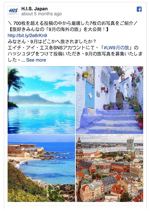 基本上,該專頁針對喜歡旅行的用戶來發佈相關資訊。其特徵在於,貼文的內容是從用戶身上募集而來的。H.I.S.先設定好讓用戶一同參與,每個月募集他們的旅行照,挑選幾張刊登在貼文上,讓每個動作都成為企劃活動的一環。
