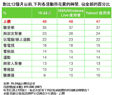 亞洲的年輕人花更多時間在網路上,其中台灣地區青少年平均花費46%的時間在網路上,而台灣MSN / Windows Live的用戶,花在網路上的時間更是比一般平均還高出兩個百分點。