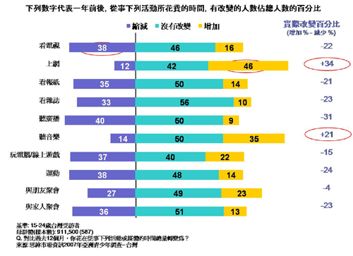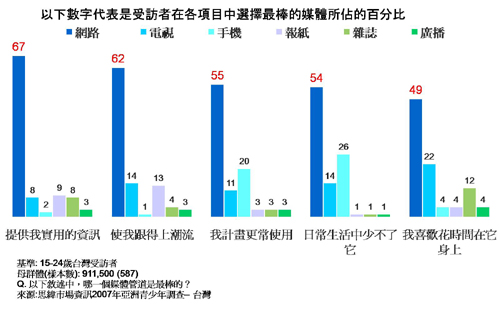 註:以上數字來自思緯市場調查公司(Synovate)所做的「2007年亞洲青少年調查」,涵蓋了8~24歲亞洲人,包括了台灣、中國、香港、印度、印尼、馬來西亞、菲律賓、新加坡、南韓以及泰國。針對8~14歲的少年,本研究採取面對面訪問的方式,針對15~24歲則改以線上訪問的方式。