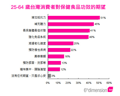 近年SARS、禽流感等致死傳染性疾病,讓一般民眾更關注「身體防禦」的議題,加上「樂活意識」逐漸興起,越來越多的消費者希望能藉由保健食品強健自己,不受疾病侵擾。TNS的調查顯示,超過8成的保健食品消費者希望吃了保健食品之後能「更強、更勇」。他們希望能「增加抵抗力」(51%)、「強化免疫系統」(40%),讓自己身體「常保最佳狀態」(41%)。不僅如此,還有45%的消費者希望保健食品就像大力水手的波菜,可以「補充體力」,讓他們繼續為忙碌的生活奮戰。