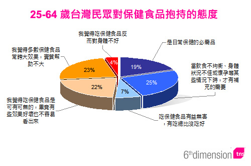 本調查是tns模範市場研究顧問公司於2008年10月4日~10月7日間,與Emailcash台灣電子郵件市調網合作執行台灣消費者對保健食品的態度與食用行為的調查,透過6th Dimension網路調查方式收集資料。研究對象為台灣25~64歲的網路使用者,有效樣本共17,701份。
