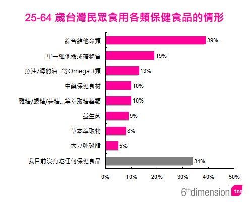 (Brain.com 台北 2008-10-27)現代人越來越重視健康,但總是忙得沒法好好吃頓飯,壓力大到夜夜失眠,甚至連出外放鬆心情的時間都抽不出來,因此能夠簡單快速保健身體的產品廣受歡迎,琳瑯滿目的保健營養食品廣告也隨處可見。根據食品工業研究所在2008年發佈的統計,台灣保健食品市場每年還有5%的成長率,到底台灣民眾吃了哪些?TNS模範市場研究公司透過EmailCash進行的調查結果顯示,超過6成的25-64歲民眾有食用保健食品的習慣。現代人的生活太忙碌,加上也不清楚自己到底缺乏哪些營養素,因此「和水吞下、一粒搞定」這種不用多花心思的產品最受歡迎,而含有各種人體所需維生素及礦物質的「綜合維他命」(39%)就成為最普遍的選擇。另外,補充特定營養素的「單一維他命/礦物質類」(19%)和「Omega 3類」(13%)也頗受歡迎。