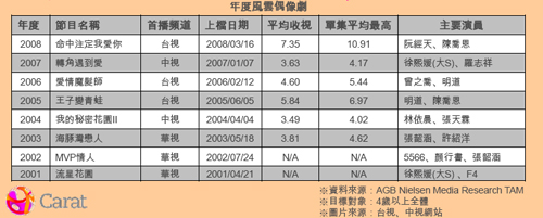 《流星花園》不僅讓主角大S與F4一砲而紅,更在海外引起廣大迴響,日韓和東南亞地區都有大批粉絲支持,也開啟台灣劇劇行銷海外另一扇窗。當時《流星花園》創下最高平均收視6.43的成績,這個紀錄直到2005年才被《王子變青蛙》超越,2008年上檔的《命中注定我愛你》收視再創新高,單集最高平均收視10.91打破了偶像劇收視紀錄,是今年至今收視最高的節目。