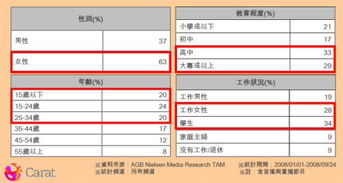 有別於動輒上百集的八點檔鄉土劇,台灣偶像劇通常為20集左右,劇情多為羅曼蒂克的愛情故事,由外型搶眼的年輕演員擔綱演出,特別吸引嚮往浪漫愛情的年輕族群,因此收視群以女性觀眾為主,主要是35歲以下的年輕女性上班族和學生族群。