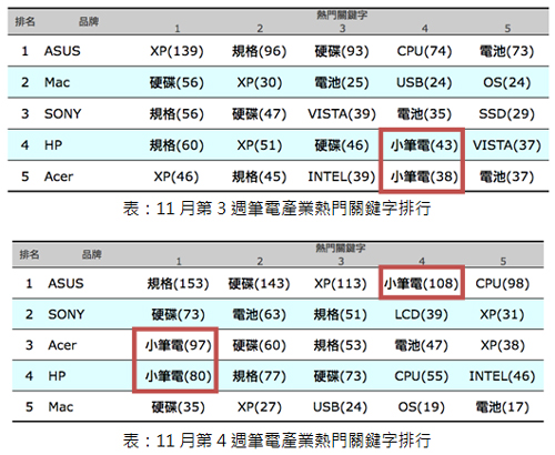 根據iBuzz研究中心的調查資料顯示, 11 月第 3 週時,「小筆電」這個關鍵字出現兩次,都居於該品牌的第四名位置。到了 11 月第 4 週時,「小筆電」出現在三個品牌的熱門關鍵字中,還榮登兩個品牌的熱門關鍵字冠軍!加上 11 月 29 日正逢資訊月開幕,自然使得 3C 相關討論更加熱烈。而從品牌熱門關鍵字排行可以看出,小筆電應該是這次資訊月消費者最關心的商品之一。