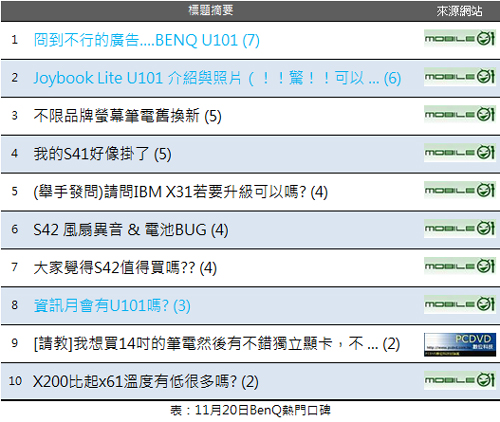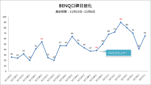 這次 BENQ 以 U101 正式邁入小筆電市場。早在之前,網路上已有風聲傳出 BENQ 即將加入小筆電戰場,因此不定時會有相關討論出現,但一直未能引起熱烈討論。直到 11 月 20 日,有 BENQ 的官方介紹和廣告的資訊釋出,使得當日十大熱門口碑中出現了三筆和 U101 相關的熱門討論話題,讓 BENQ 的口碑在這天攀上一個小高峰,得到了 54 筆口碑資料。