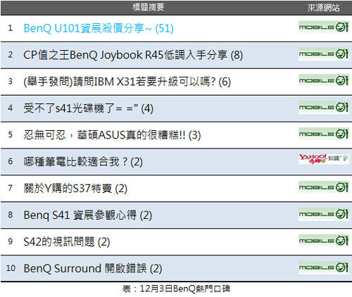 不過, 11 月 29 日才是 BENQ U101 正式上市的日子,但當日口碑只有寥寥 38 筆。但是在 29 日之後,BENQ 的口碑數量有逐漸成長的趨勢,到了 12 月 3 日, BENQ 的口碑攀上真正的高峰,當天總共得到 90 筆口碑資料。觀察當日的熱門口碑發現,雖然和 U101 相關的只有一則,但這一則的回應數高達 51 篇。這篇熱門口碑結合最熱門的資訊展和新產品,以及消費者最為關心的售價問題,因而獲得熱烈的回應。