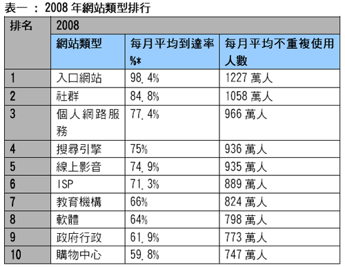 資料期間:2008年1月至12月*備註:到達率為每月瀏覽該網站訪客佔全體上網人口比例,表中所列數字為1到12月平均值