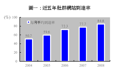 社群網站是近年來最受網友喜愛的網站類型之一。據2008年ARO調查,社群網站到達率近八成五,同時吸引超過一千萬的網友瀏覽或使用(表一),躍升為入口網站之外人氣最高的網站類型。