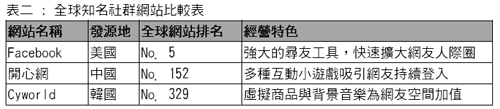 同時,社群網站發展快速,到達率在短短五年內從50% 大幅提高至85%(圖一),能有如此爆炸性的成長,得歸功於知名社群網站的成功經營。例如美國的Facebook、韓國的Cyworld、台灣的無名小站、以及中國的開心網等,都是社群網站中的佼佼者,且各具特色。