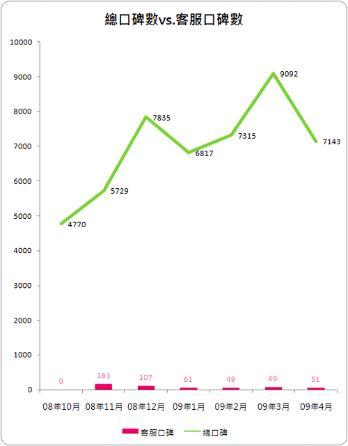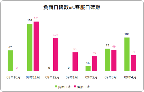 而比較各月的熱門負面議題熱度和客服相關口碑數可知,2008年11月負面口碑和客服口碑與其他月份相比都較高,12月到隔年2月,客服口碑和負面口碑都變少,但負面口碑數量更少。到了2009年的3月和4月,負面口碑數又超越客服口碑數。由上圖可發現,客服口碑和負面口碑數量並沒有明顯的正相關。
