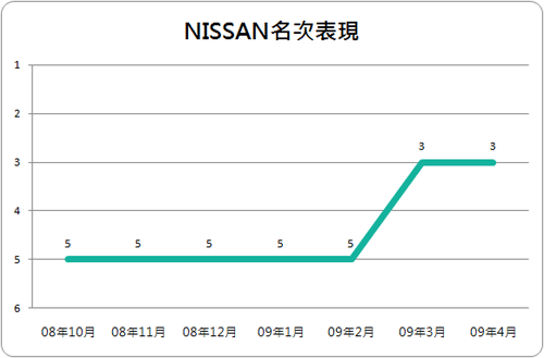 從2008年10月~2009年2月,Nissan的口碑排名表現一直在第五名徘徊,今年3、4月則進步到季軍位置。而去年11月時線上客服專區成立,無論在11月當月或是隔月,還沒有馬上Nissan的名次往上推,但在成立三個月後,名次則出現顯著上升。