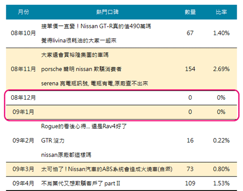 上圖為2008年10月~2009年4月熱門口碑議題中的負面口碑和總口碑數的比例。在2008年10月Nissan還沒有推出線上客服服務時,共有兩則較負面的話題登上熱門口碑,占總數的1.40%;2008年11月11日Nissan線上客服正式上線,當月的負面口碑達3則,負評比率為2.69%。但在2008年12月~2009年3月期間,負評比例都相當低。直到2009年4月,關於Nissan不肖業代的負面議題引起消費者的重視,負評比率為1.53%。