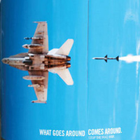 來自紐約的BIG ANT International工作室為世界和平組織製作了一系列海報。 乍看之下,海報內看不出有任何反戰的思想存在,但是將它環繞在街頭的電線桿上,世界和平組織想傳達的反戰訊息便不言而喻了。 你會看到所有海報中使用的武器環繞了一圈之後,瞄準的竟然是自己的背後,而海報最下面的「What Goes Around」與「Comes Around」本來是分開的,連在一起後,就變成了一句完整的英文諺語「What goes around, comes around(因果報應)」,而這也是這系列海報強調的中心概念-「戰爭不但對世界造成傷害,最終,這種傷害會降臨在自己的頭上」。