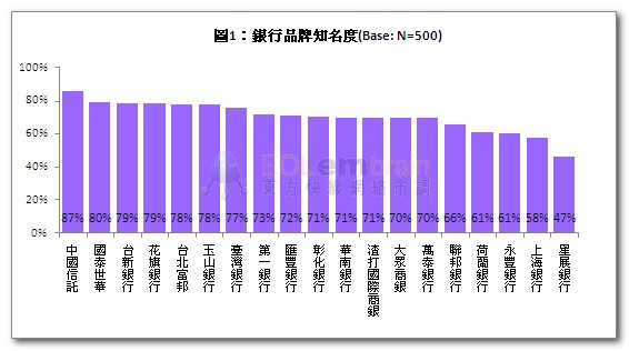 根據調查結果顯示,當詢問消費者知道或聽過哪些銀行品牌時,以中國信託知名度最高(87%),其次則為國泰世華(80%)及台新銀行(79%)。