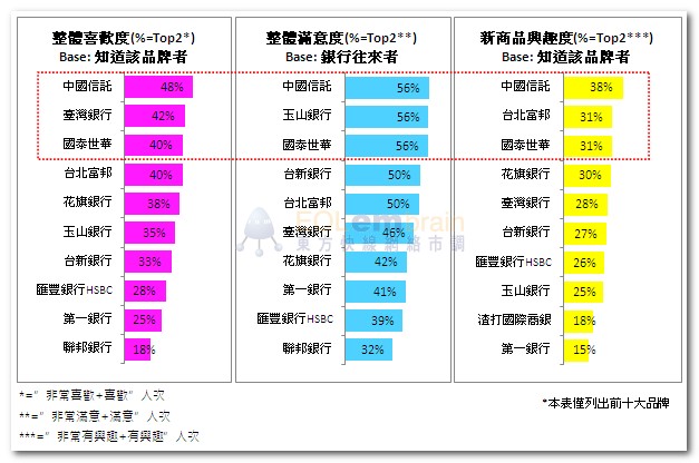 (Brain.com 2011-03-28)EOLembrain東方快線3月最新執行完成的「金融品牌形象調查」,以銀行品牌為評量對象,從「品牌整體喜歡程度」、「整體使用滿意度」及「新商品興趣度」三項指標進行評量。本次納入評量品牌有,大眾商銀、中國信託、台北富邦、台新銀行、永豐銀行、玉山銀行、國泰世華、第一銀行、華南銀行、萬泰銀行、彰化銀行、臺灣銀行、上海銀行、聯邦銀行、花旗銀行 citibank、星展銀行DBS、荷蘭銀行、渣打國際商銀、匯豐銀行HSBC。家喻戶曉中信金