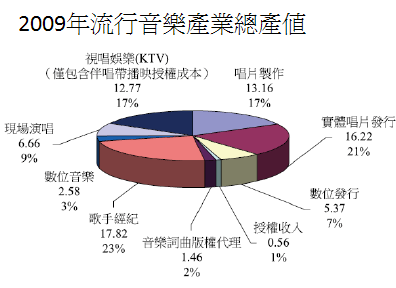 根據行政院新聞局報告指出,2009年流行音樂產業總產值推估為76.59億,其中實體唱片的發行達16.22億元,約佔21%。而現場演唱產值達6.66億元,佔了9%。