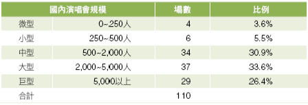 台灣的部份,依新聞局報告指出,2009年售票演唱會場次共計110場。平均每3天就有一場,密度相當高,其中約6成為超過2千人的大型規模場次。而場地的部份則以國際會議中心與台北小巨蛋舉辦場次最多。