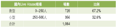 此外,Live House規模的表演一年更超過一千場,舉辦場地則多辦在ez5 live house、THE WALL、河岸留言等,小型的Live House也台灣國內現場演唱的重要來源,更為孕育新生代歌手樂團的搖籃。