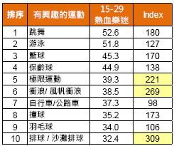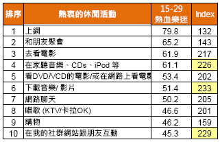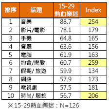 從族群輪廓中得知熱血樂迷主要是15至29歲的年輕族群,接下來將深入觀察15-29歲熱血樂迷的生活型態、熱衷的活動及討論的話題。