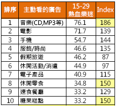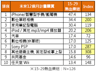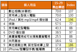1. 音樂播放器:76%對音樂相關的廣告感興趣,相較全體,擁有或計畫購買音樂播放器(如iPod、mp3、mp4播放器)的Index也較突出,顯示音樂是他們重視的核心商品。