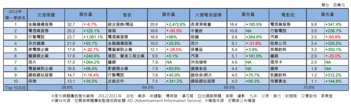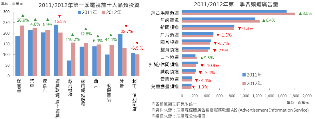 2012年第一季整體電視廣告量較2011年微幅上升1.6%。前十大品類中,成長幅度及金額皆居冠的政府機構,主要針對節能減碳的各式e化政策與便民服務進行宣傳。成長幅度位居第二、三名的一般保養品及保養品因開架商品廠商持續運用代言人推廣多功效產品。以電視為主要投資媒體的牙膏品類在電視宣傳上則減少32.7%的廣告投資金額。