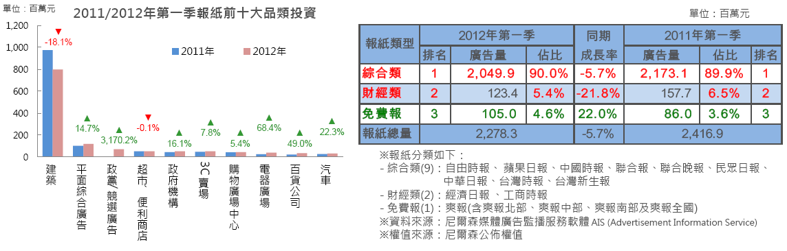 與2011年同期比較,2012年第一季整體報紙廣告量縮減5.7%,主要來自於建築類的投資下滑所致。