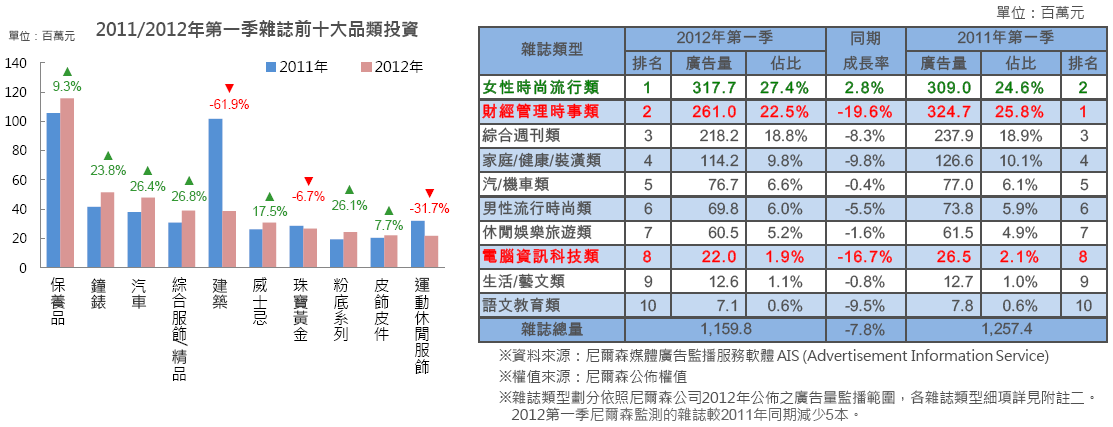 2012年第一季前十大品類中雖有七類廣告投資有成長,但仍無法補回建築類及運動休閒服飾品類縮減的廣告投資,形成整體雜誌廣告量縮減7.8%。