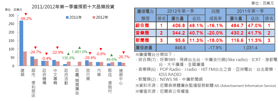 廣播類在2012年第一季的廣告量較2011年大幅下滑17.9%,主要受到建築類縮減約68.2%的投資金額所致;主打國外旅遊的旅行業投資下滑幅度居次;此外尚有各大便利商店、中文專輯、及補習中心皆呈現二位數以上投資縮減。
