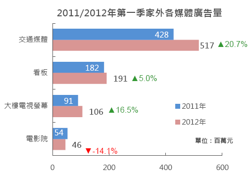 2012年整體家外廣告成長14.0%,為五大媒體中上升幅度最高且增加金額也最多的媒體,主要來自於電話事務機類(電信業服務、行動電話)及服務類(中餐飲、飯店∕渡假村、百貨公司)增加超過70%投資金額。
