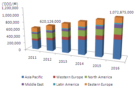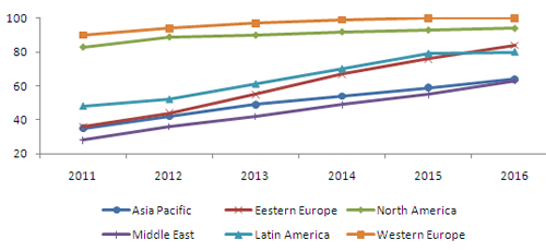 截至2011年底,全球使用數位電視的家戶數約為六億二千萬戶(圖三),預估到2016年將會有超過十億個數位家庭用戶。這些用戶中以西歐及北美的發展最為成熟,預估到了2016年歐美兩區的數位電視滲透率將會達到90%以上(圖四)。其中北美地區預估將在2014年成為完全數位訊號的使用國家。