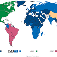 目前全球數位電視主要分成幾個使用系統,分別是歐洲方面採行的DVB-T,北美地區所使用的ATSC,以及日本地區改良DVB-T系統而成的ISDB-T(圖一)。