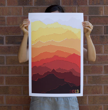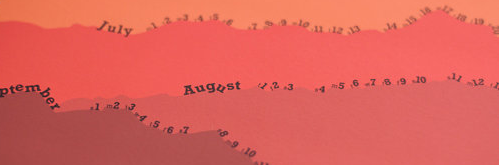 將連綿相疊的山峰當作月份,日期數字細細小小地印在每條分隔線上,又是一款挑戰眼力的設計。月份在前,數字們在後頭排隊跟著,很有母雞帶小雞的可愛視覺效果。