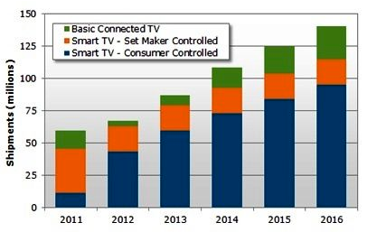 2011年至2016年智慧電視出貨量展望認為,包括HTML-5在內的開放式標準,將有助於解決智慧電視軟體更新和硬體淘汰的問題,具備這些開放標準的電視,也將對廉價的串流媒體播放機形成較大的威脅。NPD DisplaySearch的統計顯示,預計2012年全年出貨量將達4,300萬台;而該數字可望在2016年將成長至9,500萬。