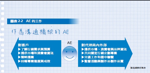 AE 負責和客戶接洽,針對客戶的需求、品牌問題和市場狀況提供專業的建議,接著收集與彙整相關的資料,帶入工作團隊,和創意部、策略部一起擬定傳播策略。行銷傳播產業的企劃涉及層面很廣,除了要考量如何幫助客戶增加銷售業績,還要注意消費者族群、傳播工具、媒體通路和行銷議題等元素。