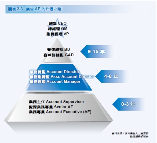 廣告AE 的升遷路徑循著資深業務專員(Senior AE)、業務經理(Account Manager)、業務總監(Account Direct)、客戶群總監(Group Account Direct)逐漸往上爬升。