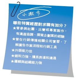 因工作內容以服務客戶為主,許多代理商會依業務性質或客戶需求來徵才,沒有一定的求才標準,比起科系、學歷,適合這個產業的人格特質和工作能力更重要,優秀的語言能力是一大加分。有些大型國際廣告公司較注重求職者的資歷,如果沒有相關的實習或工作經驗,可以考慮先到中小型的廣告公司應徵,累積足夠的經驗。