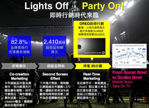 品牌透過社群媒體與消費者進行即時的對話,已逐漸成為不可或缺的行銷環節。尤其,突發事件發生時,更成為品牌與消費者溝通的最佳時機。以本次超級盃賽事而言,在第三節僅開打1分32秒之際,超級巨蛋突然一片漆黑,發生斷電意外,比賽被迫暫停35分鐘,不少腳步快速的品牌商立即開始在社群媒體上比劃。