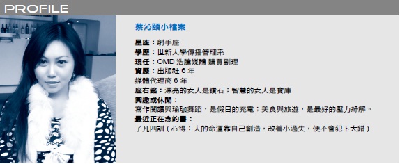 有人覺得媒體購買聽起來手握大筆預算,趾高氣昂又光鮮亮麗。蔡沁頤倒覺得自己像個雙面人,面對客戶(買家)時,要細心按照客戶需求,端出豐盛的菜單;而當面對媒體(賣方)時,要略帶強勢、嚴肅地為客戶的權益發聲。