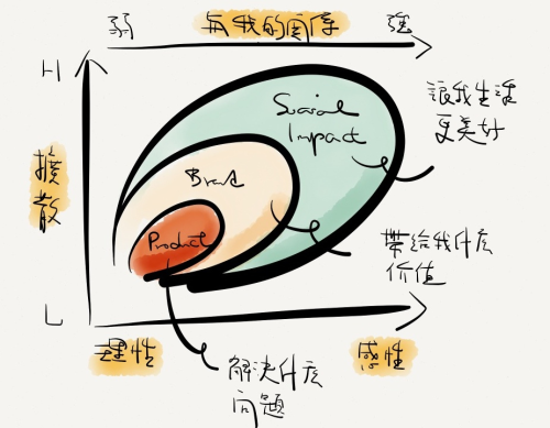 如果用「選擇結婚對象」來比喻這三個圓的關係的話,Social Impact,就是這個人有沒有理想、抱負,對未來的計劃;Brand,就是他的個性,觀念,好不好相處;Product,就是他的條件如何,學經歷,家世背景。你選擇一個人,一定是因為他的全部。如果妳光憑條件,就決定要託付終生的對象,我也只能祝福妳,上輩子燒好香,不要選到一個「當律師的炸彈客」了。