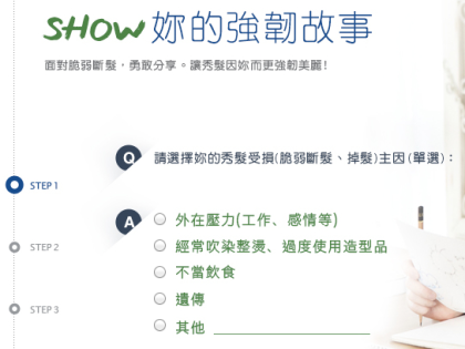 延續以「蔡燦得的自信Show髮」活動來舉例,在活動網頁上,其實說的還是產品。表面上,雖然包裝了一個「Show妳的強韌故事」,企圖要傳達Brand的意念,還設計了三步驟,要妳上傳妳的故事,但可惜,整個內容還是停留在溝通產品的層次上。
