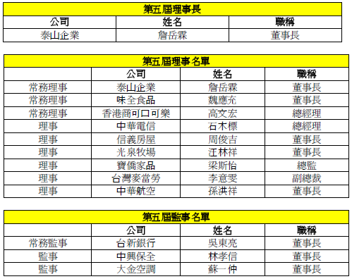 理事長一職由泰山企業董事長詹岳霖,以過半票數高票當選,詳細理監事名單如下:
