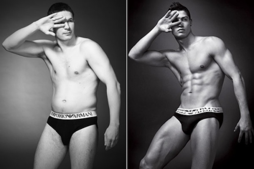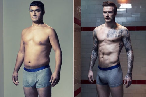 英國太陽報找來幾位「平凡人」與帥氣的名人來個大比拼,看看誰比較有吸引力,同時也讓大家了解現實的殘酷。畢竟不可能每個人穿上這些名牌內褲,就能變得跟運動球星與模特兒一樣帥氣結實,還是得讓消費者面對實際穿上去的樣子才行。