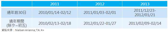 以下收視區間是定義本專題中,比較每年農曆春節期間與過年前的收視率基準。農曆春節期間包含除夕至初五,共計6天;過年前的收視比較基準指的是除夕前30天。