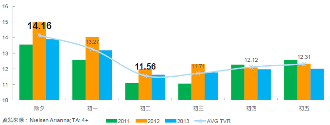 比較前三年除夕至初五的收視率,收視高點落在除夕,平均收視率為14.16;最低點則落在初二回娘家的日子,平均收視率為11.56。