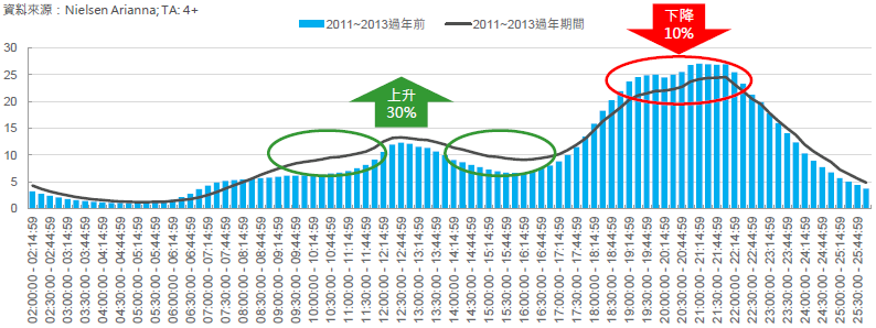 •晚上6點至11點的黃金時段,年節期間平均收視反而較過年前下降10%。