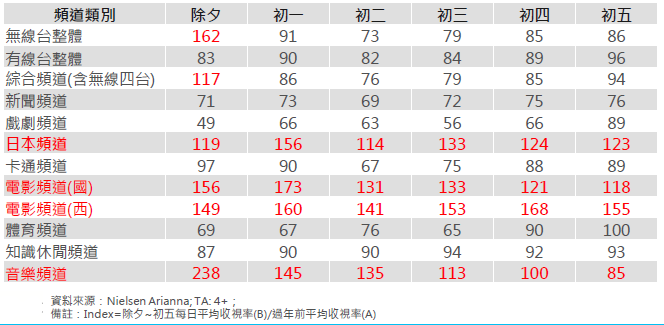 在過年期間,新聞及戲劇頻道觀眾流失明顯,但日本、電影、音樂頻道則會相較成長。