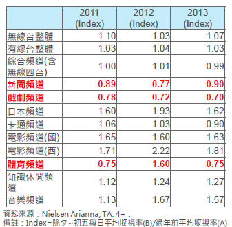 電影頻道最受民眾歡迎,不論是國片或西片,在過年期間都會推出年度強檔電影,直接影響觀眾收看意願,在過年期間平均收視率均能大幅上升。•日本頻道在過年期間習慣推出特別的綜藝節目,因此平均收視率均有六成以上的成長。